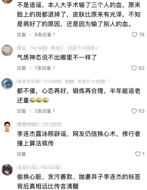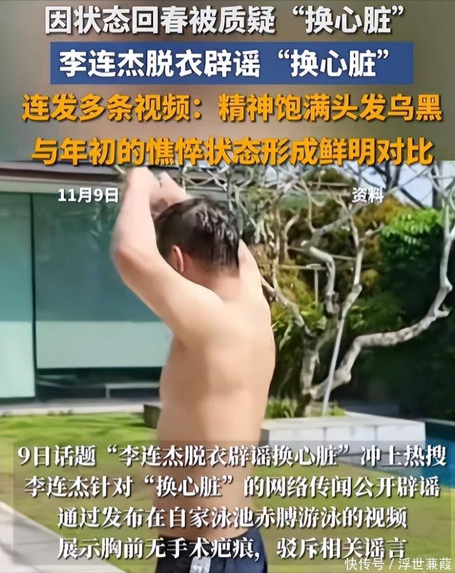 面对愈演愈烈的揣测,李连杰果断出击,上传一段无字幕视频:站在泳池边,他径直脱去上衣,镜头环绕拍摄其背部、胸前、肋侧,全程未见任何大型手术痕迹,甚至连细小切口都无从寻觅。